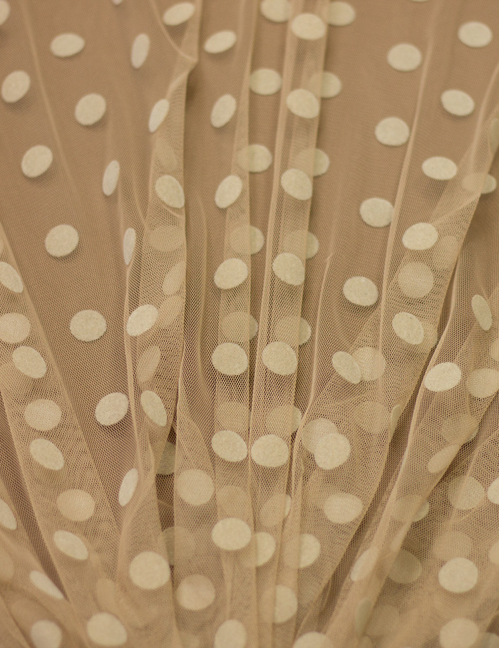 Тонкая эластичная и полупрозрачная сетка с нежным принтом - горох. Лицевая сторона представляет собой сетчатую поверхность с мягким рельефным рисунком, имитирующим бархат. Применяется для декорирования деталей одежды, а так же для изготовления спортивных и танцевальных костюмов, нарядной и повседневной одежды.