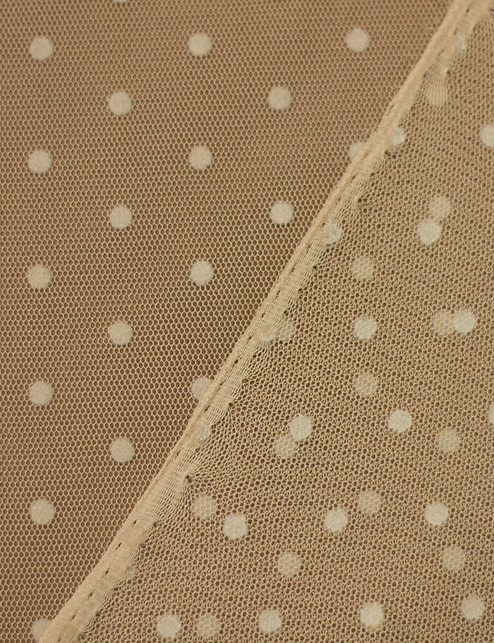 Тонкая эластичная и полупрозрачная сетка с нежным принтом - горох. Лицевая сторона представляет собой сетчатую поверхность с мягким рельефным рисунком, имитирующим бархат. Применяется для декорирования деталей одежды, а так же для изготовления спортивных и танцевальных костюмов, нарядной и повседневной одежды.